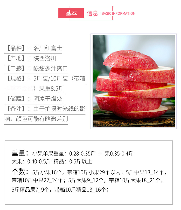 1、产品名称:陕西洛川红富士苹果 2、发货地:陕西 3、鲜果供货周期:9月-12月底 4、默认快递:中通、邮政等快递随机,发顺丰联系客服。 5、包装方式:纸箱+网套 6、,一件代发。 7、一件代发到货区域:除新疆西藏内蒙海南不发,其他地区包邮通发。 8、产品特性/食用说明:脆甜汁水充足。全成熟发货,请。 9、售后赔付标准:签收24小时内把坏果和快递放一起拍照,按坏果个数赔付。轻微碰伤/口感差异不售后。具体重量根据数量,和重量,满格综合得出,因天气原因,快递运输,个别果子因天热会出现个别黑红点,黑红点不超过大拇指均不影响使用不在理赔范围之内,包装种类较多,包装种类不做理赔说明介意者慎拍。 10,五斤装,因快递原因,五斤装下单尽量下2的培数我们发货合并发货十斤装。单数不发货。
